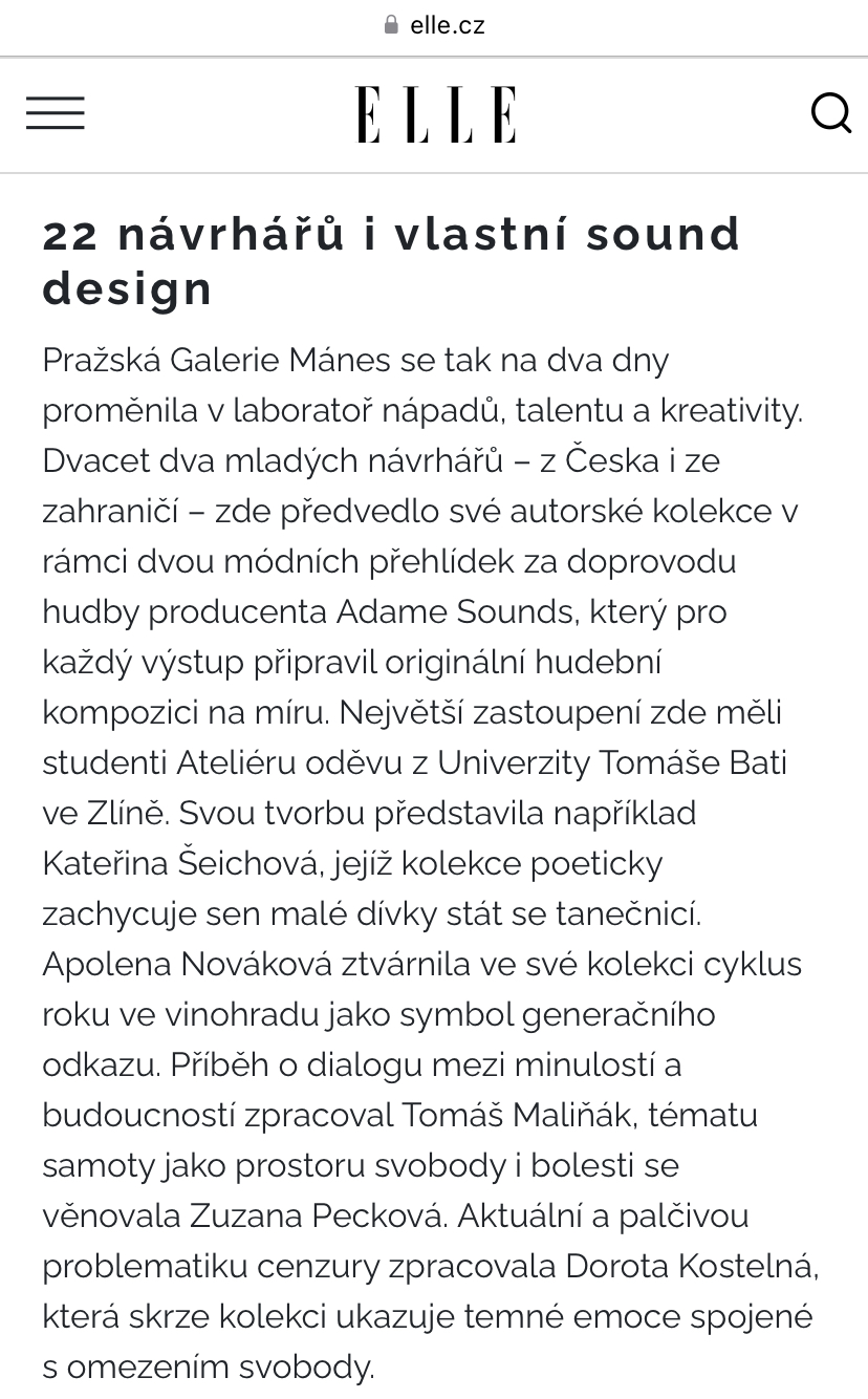 [EN]: “Twenty two young designers from the Czech Republic and abroad presented their original collections in two fashion shows accompanied by music of producer Adame Sounds, who prepared an original musical composition for each show.” Source: ELLE